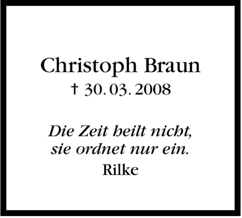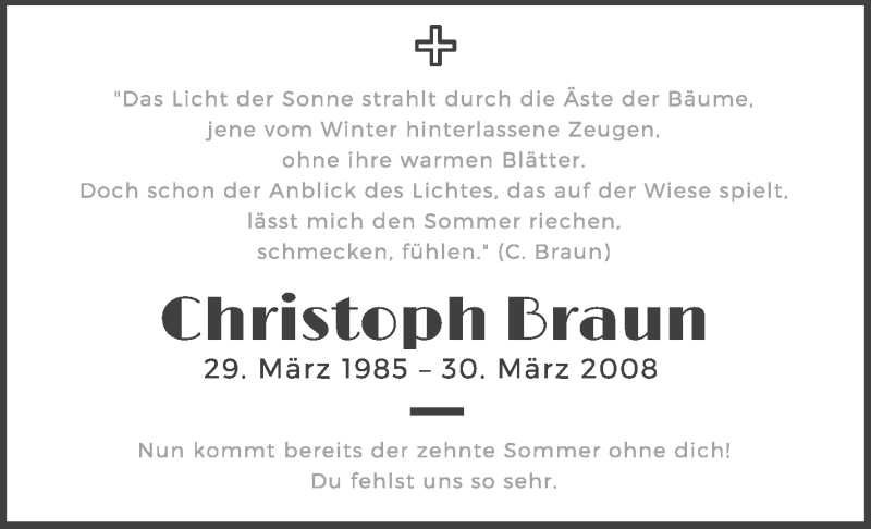 Hier finden Sie alle Traueranzeigen aus der Zeitung, die bisher für Christoph Braun erschienen sind. Weitere Traueranzeigen, die in der Zeitung erscheinen, werden hier ebenfalls aufgelistet