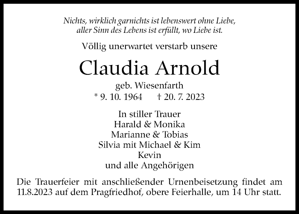 Hier finden Sie alle Traueranzeigen aus der Zeitung, die bisher für Claudia Arnold erschienen sind. Weitere Traueranzeigen, die in der Zeitung erscheinen, werden hier ebenfalls aufgelistet