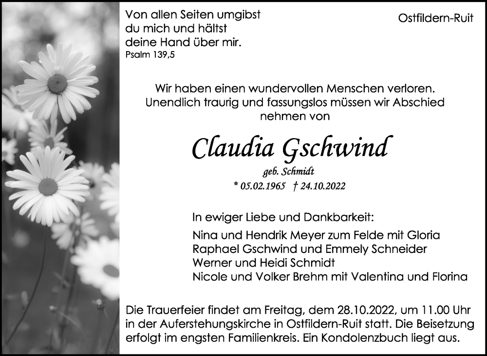 Hier finden Sie alle Traueranzeigen aus der Zeitung, die bisher für Claudia Gschwind erschienen sind. Weitere Traueranzeigen, die in der Zeitung erscheinen, werden hier ebenfalls aufgelistet