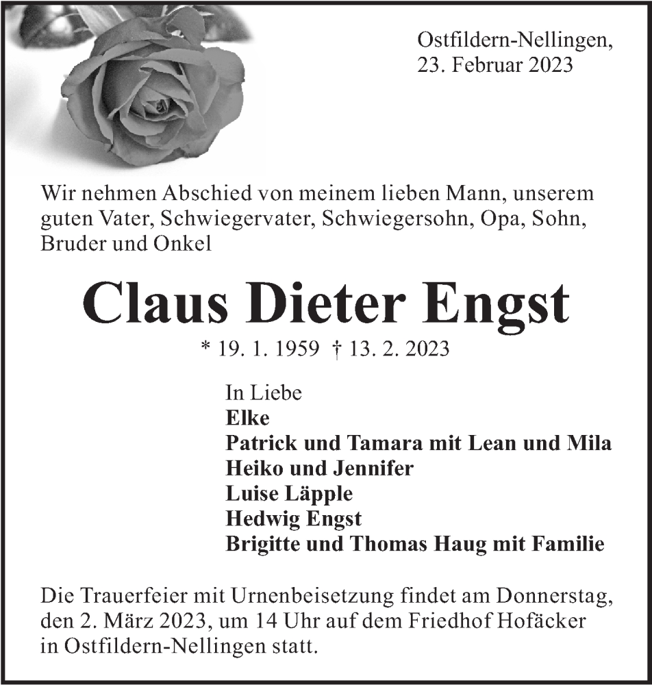 Hier finden Sie alle Traueranzeigen aus der Zeitung, die bisher für Claus Dieter Engst erschienen sind. Weitere Traueranzeigen, die in der Zeitung erscheinen, werden hier ebenfalls aufgelistet