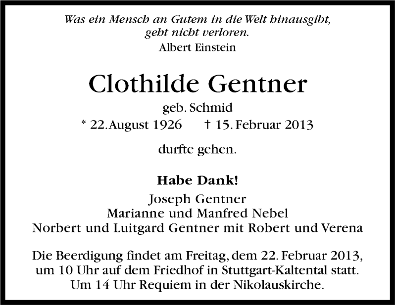Hier finden Sie alle Traueranzeigen aus der Zeitung, die bisher für Clothilde Gentner erschienen sind. Weitere Traueranzeigen, die in der Zeitung erscheinen, werden hier ebenfalls aufgelistet