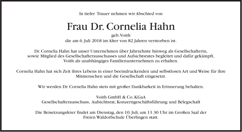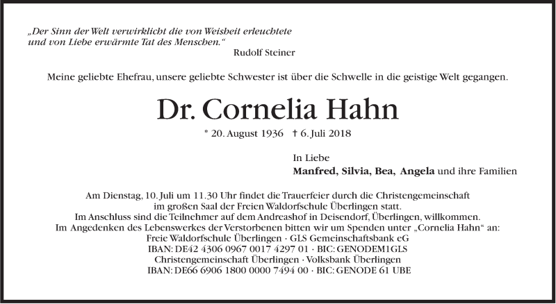 Hier finden Sie alle Traueranzeigen aus der Zeitung, die bisher für Cornelia Hahn erschienen sind. Weitere Traueranzeigen, die in der Zeitung erscheinen, werden hier ebenfalls aufgelistet
