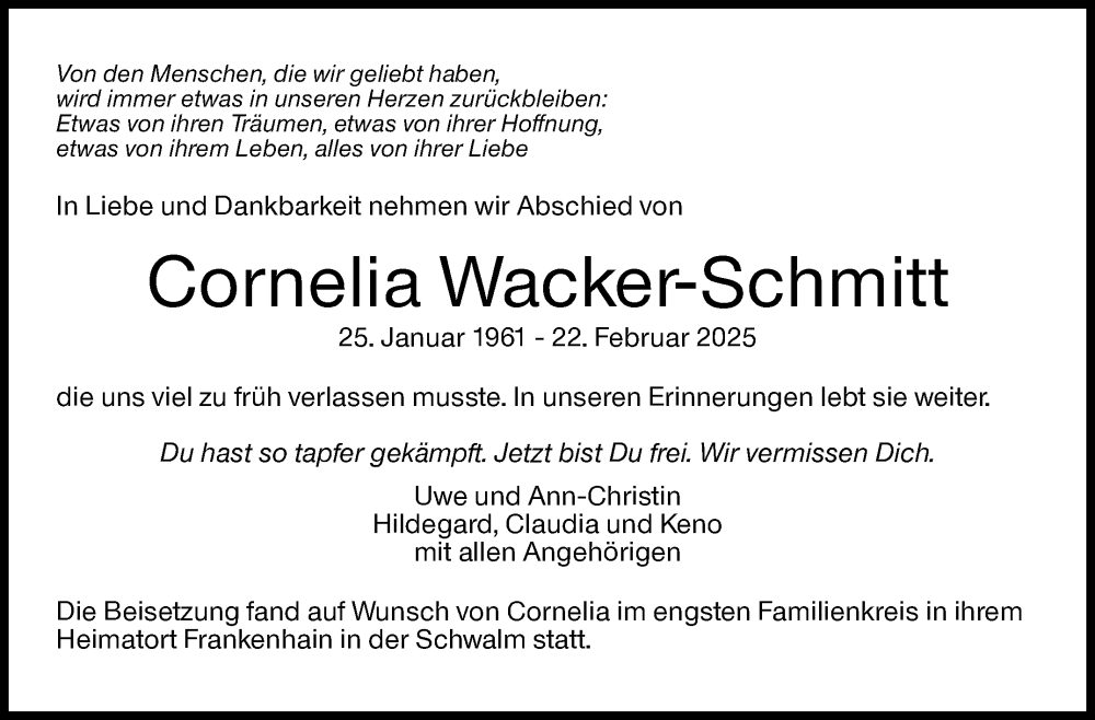 Hier finden Sie alle Traueranzeigen aus der Zeitung, die bisher für Cornelia Wacker-Schmitt erschienen sind. Weitere Traueranzeigen, die in der Zeitung erscheinen, werden hier ebenfalls aufgelistet