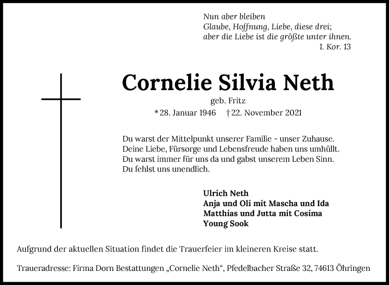 Hier finden Sie alle Traueranzeigen aus der Zeitung, die bisher für Cornelie Silvia Neth erschienen sind. Weitere Traueranzeigen, die in der Zeitung erscheinen, werden hier ebenfalls aufgelistet