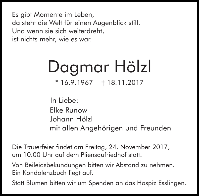 Hier finden Sie alle Traueranzeigen aus der Zeitung, die bisher für Dagmar Hölzl erschienen sind. Weitere Traueranzeigen, die in der Zeitung erscheinen, werden hier ebenfalls aufgelistet