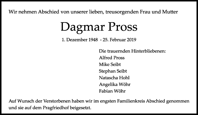 Hier finden Sie alle Traueranzeigen aus der Zeitung, die bisher für Dagmar Pross erschienen sind. Weitere Traueranzeigen, die in der Zeitung erscheinen, werden hier ebenfalls aufgelistet