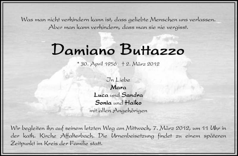 Hier finden Sie alle Traueranzeigen aus der Zeitung, die bisher für Damiano Buttazzo erschienen sind. Weitere Traueranzeigen, die in der Zeitung erscheinen, werden hier ebenfalls aufgelistet