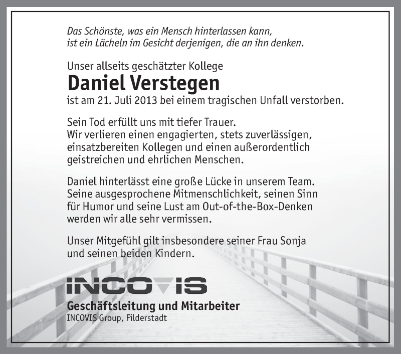 Hier finden Sie alle Traueranzeigen aus der Zeitung, die bisher für Daniel Verstegen erschienen sind. Weitere Traueranzeigen, die in der Zeitung erscheinen, werden hier ebenfalls aufgelistet