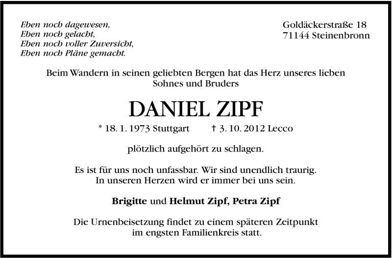 Hier finden Sie alle Traueranzeigen aus der Zeitung, die bisher für Daniel Zipf erschienen sind. Weitere Traueranzeigen, die in der Zeitung erscheinen, werden hier ebenfalls aufgelistet