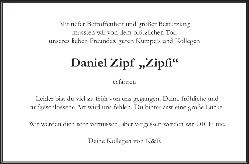 Hier finden Sie alle Traueranzeigen aus der Zeitung, die bisher für Daniel Zipf erschienen sind. Weitere Traueranzeigen, die in der Zeitung erscheinen, werden hier ebenfalls aufgelistet