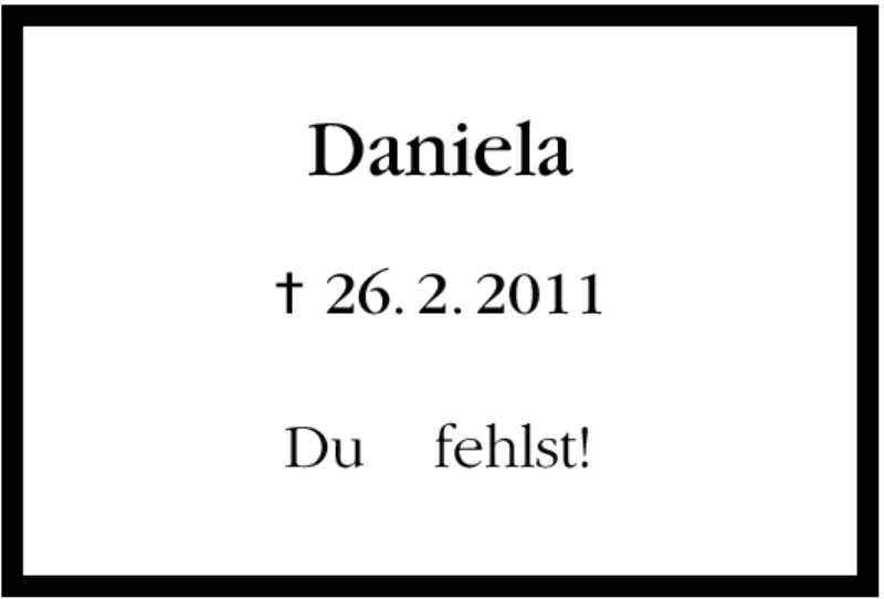 Hier finden Sie alle Traueranzeigen aus der Zeitung, die bisher für Daniela erschienen sind. Weitere Traueranzeigen, die in der Zeitung erscheinen, werden hier ebenfalls aufgelistet