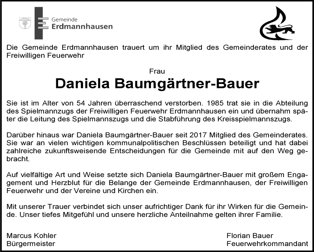Hier finden Sie alle Traueranzeigen aus der Zeitung, die bisher für Daniela Baumgärtner-Bauer erschienen sind. Weitere Traueranzeigen, die in der Zeitung erscheinen, werden hier ebenfalls aufgelistet