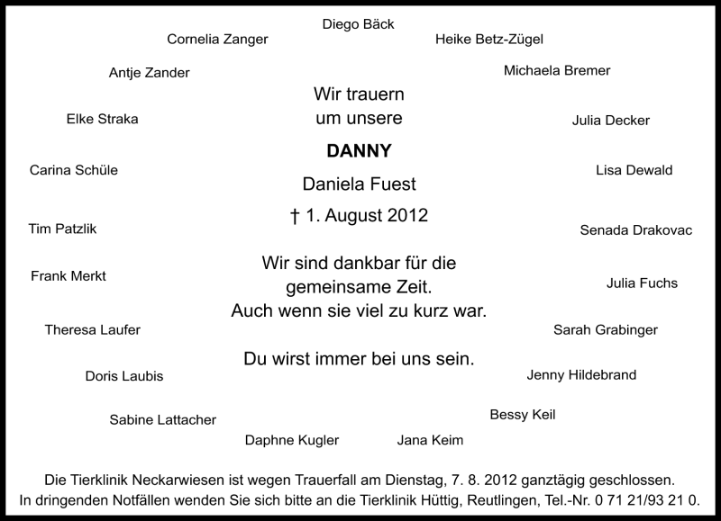 Hier finden Sie alle Traueranzeigen aus der Zeitung, die bisher für Daniela Fuest erschienen sind. Weitere Traueranzeigen, die in der Zeitung erscheinen, werden hier ebenfalls aufgelistet