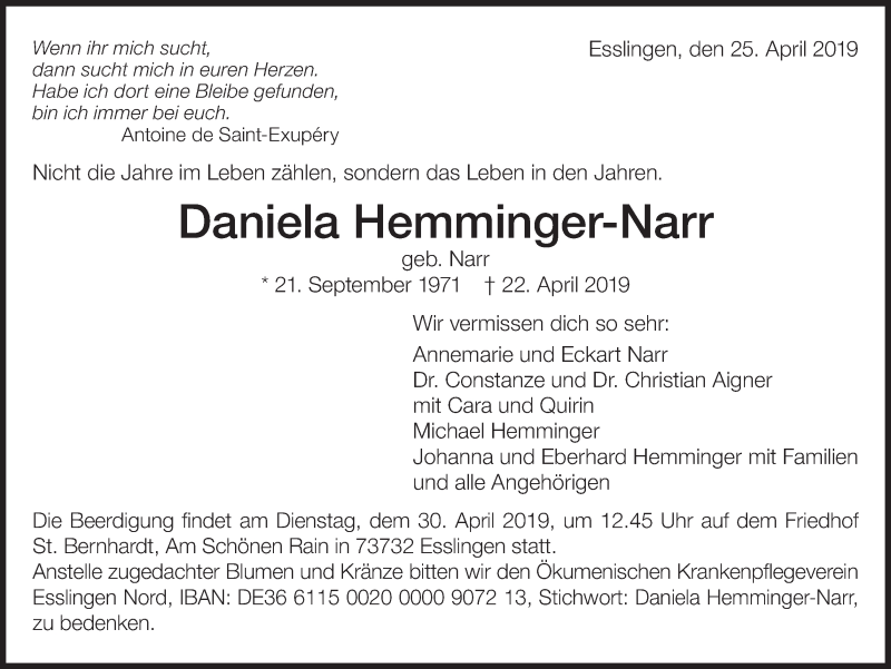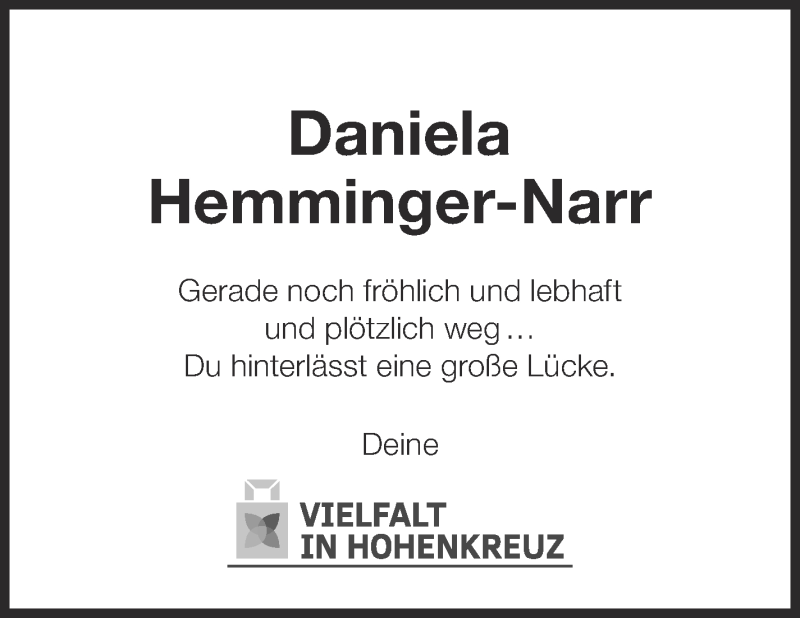 Hier finden Sie alle Traueranzeigen aus der Zeitung, die bisher für Daniela Hemminger-Narr erschienen sind. Weitere Traueranzeigen, die in der Zeitung erscheinen, werden hier ebenfalls aufgelistet