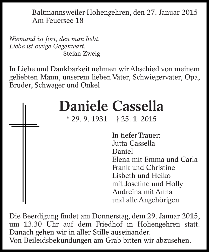 Hier finden Sie alle Traueranzeigen aus der Zeitung, die bisher für Daniele Cassella erschienen sind. Weitere Traueranzeigen, die in der Zeitung erscheinen, werden hier ebenfalls aufgelistet