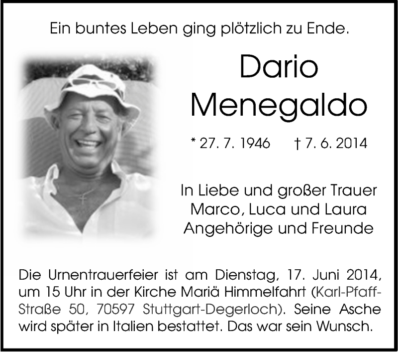 Hier finden Sie alle Traueranzeigen aus der Zeitung, die bisher für Dario Menegaldo erschienen sind. Weitere Traueranzeigen, die in der Zeitung erscheinen, werden hier ebenfalls aufgelistet