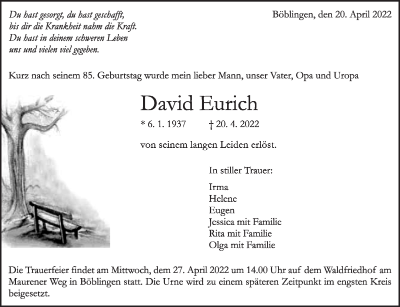 Hier finden Sie alle Traueranzeigen aus der Zeitung, die bisher für David Eurich erschienen sind. Weitere Traueranzeigen, die in der Zeitung erscheinen, werden hier ebenfalls aufgelistet