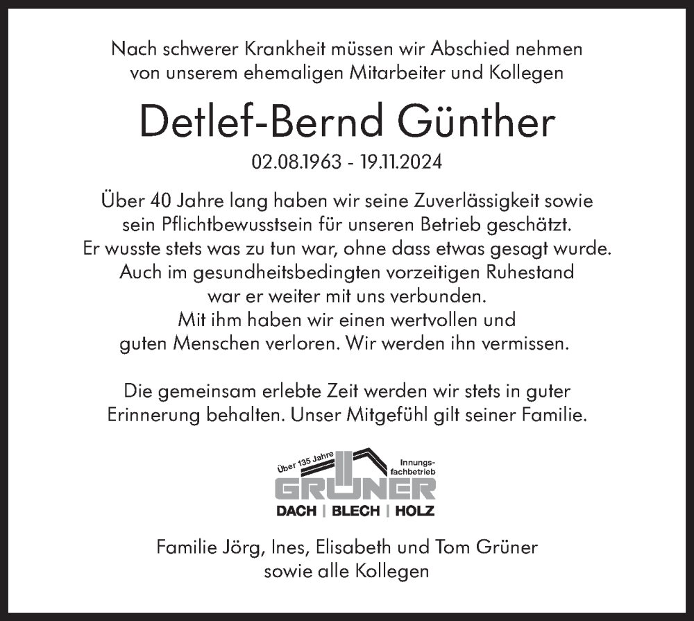 Hier finden Sie alle Traueranzeigen aus der Zeitung, die bisher für Detlef-Bernd Günther erschienen sind. Weitere Traueranzeigen, die in der Zeitung erscheinen, werden hier ebenfalls aufgelistet