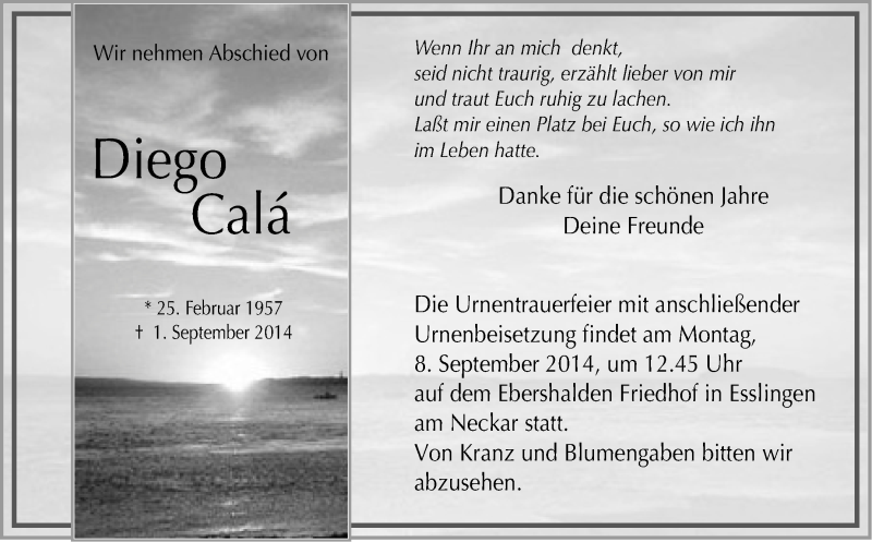 Hier finden Sie alle Traueranzeigen aus der Zeitung, die bisher für Diego Cala erschienen sind. Weitere Traueranzeigen, die in der Zeitung erscheinen, werden hier ebenfalls aufgelistet