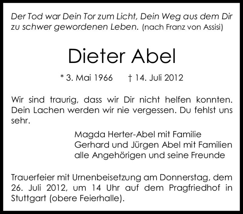 Hier finden Sie alle Traueranzeigen aus der Zeitung, die bisher für Dieter Abel erschienen sind. Weitere Traueranzeigen, die in der Zeitung erscheinen, werden hier ebenfalls aufgelistet