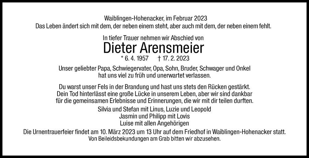 Hier finden Sie alle Traueranzeigen aus der Zeitung, die bisher für Dieter Arensmeier erschienen sind. Weitere Traueranzeigen, die in der Zeitung erscheinen, werden hier ebenfalls aufgelistet