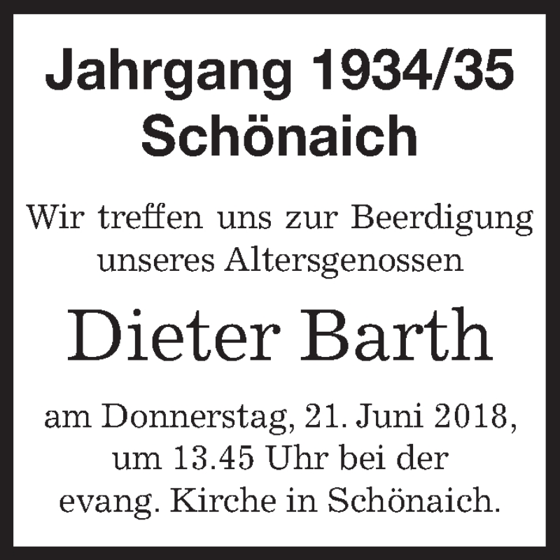 Hier finden Sie alle Traueranzeigen aus der Zeitung, die bisher für Dieter Barth erschienen sind. Weitere Traueranzeigen, die in der Zeitung erscheinen, werden hier ebenfalls aufgelistet