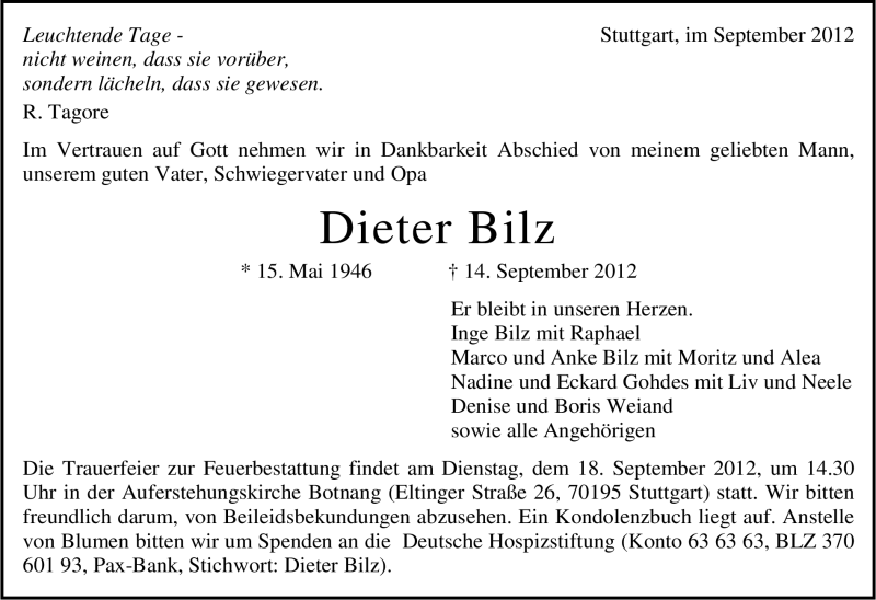 Hier finden Sie alle Traueranzeigen aus der Zeitung, die bisher für Dieter Bilz erschienen sind. Weitere Traueranzeigen, die in der Zeitung erscheinen, werden hier ebenfalls aufgelistet