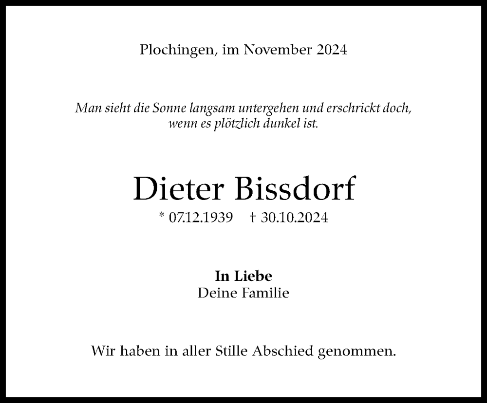 Hier finden Sie alle Traueranzeigen aus der Zeitung, die bisher für Dieter Bissdorf erschienen sind. Weitere Traueranzeigen, die in der Zeitung erscheinen, werden hier ebenfalls aufgelistet