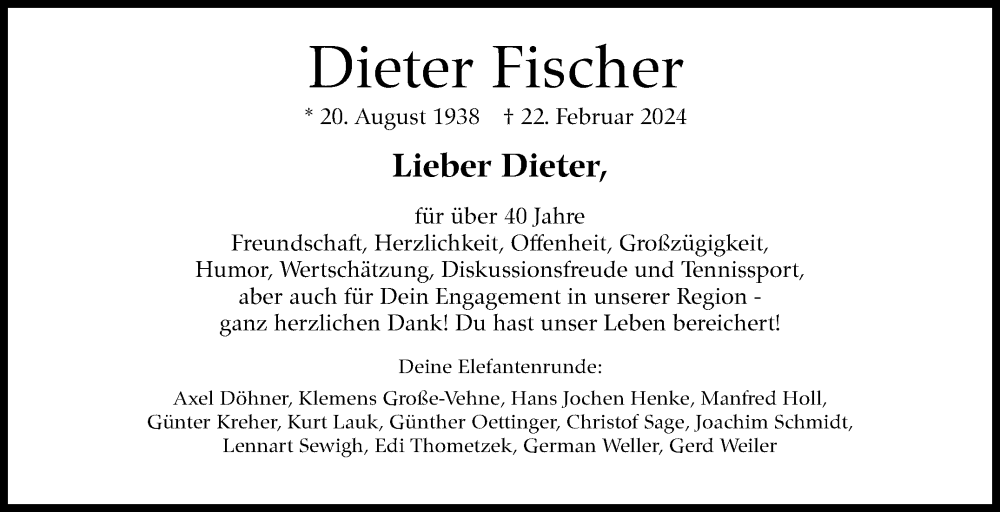 Hier finden Sie alle Traueranzeigen aus der Zeitung, die bisher für Dieter Fischer erschienen sind. Weitere Traueranzeigen, die in der Zeitung erscheinen, werden hier ebenfalls aufgelistet