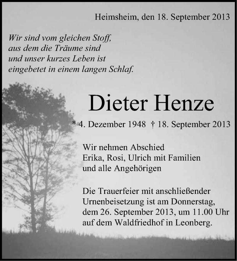 Hier finden Sie alle Traueranzeigen aus der Zeitung, die bisher für Dieter Henze erschienen sind. Weitere Traueranzeigen, die in der Zeitung erscheinen, werden hier ebenfalls aufgelistet