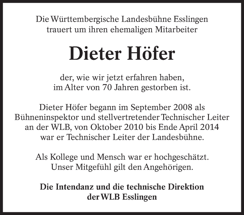 Hier finden Sie alle Traueranzeigen aus der Zeitung, die bisher für Dieter Höfer erschienen sind. Weitere Traueranzeigen, die in der Zeitung erscheinen, werden hier ebenfalls aufgelistet