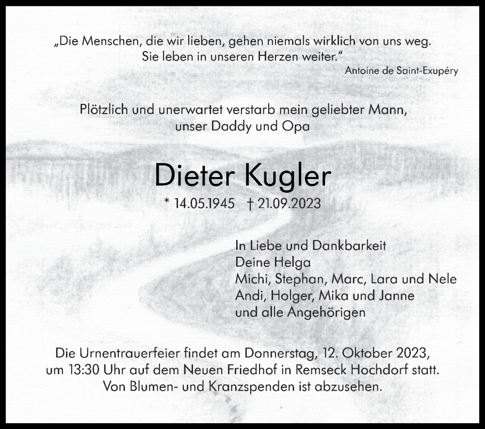 Hier finden Sie alle Traueranzeigen aus der Zeitung, die bisher für Dieter Kugler erschienen sind. Weitere Traueranzeigen, die in der Zeitung erscheinen, werden hier ebenfalls aufgelistet