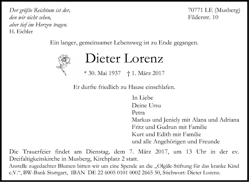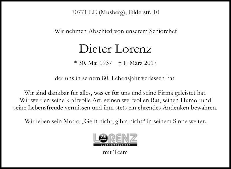 Hier finden Sie alle Traueranzeigen aus der Zeitung, die bisher für Dieter Lorenz erschienen sind. Weitere Traueranzeigen, die in der Zeitung erscheinen, werden hier ebenfalls aufgelistet
