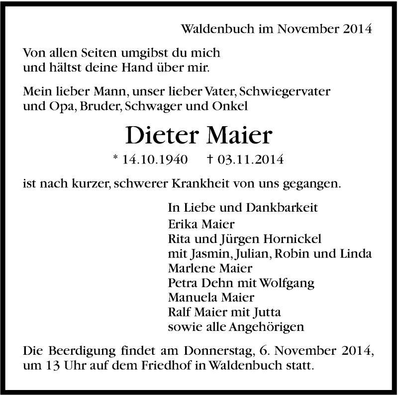 Hier finden Sie alle Traueranzeigen aus der Zeitung, die bisher für Dieter Maier erschienen sind. Weitere Traueranzeigen, die in der Zeitung erscheinen, werden hier ebenfalls aufgelistet