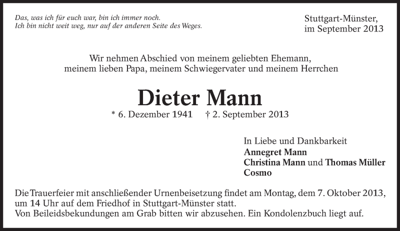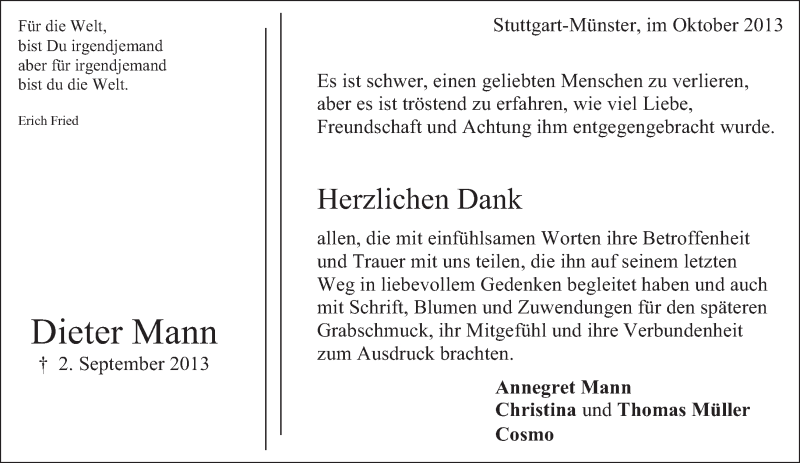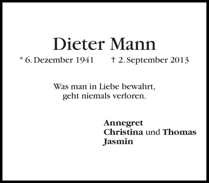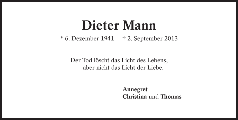 Hier finden Sie alle Traueranzeigen aus der Zeitung, die bisher für Dieter Mann erschienen sind. Weitere Traueranzeigen, die in der Zeitung erscheinen, werden hier ebenfalls aufgelistet
