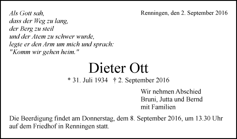 Hier finden Sie alle Traueranzeigen aus der Zeitung, die bisher für Dieter Ott erschienen sind. Weitere Traueranzeigen, die in der Zeitung erscheinen, werden hier ebenfalls aufgelistet