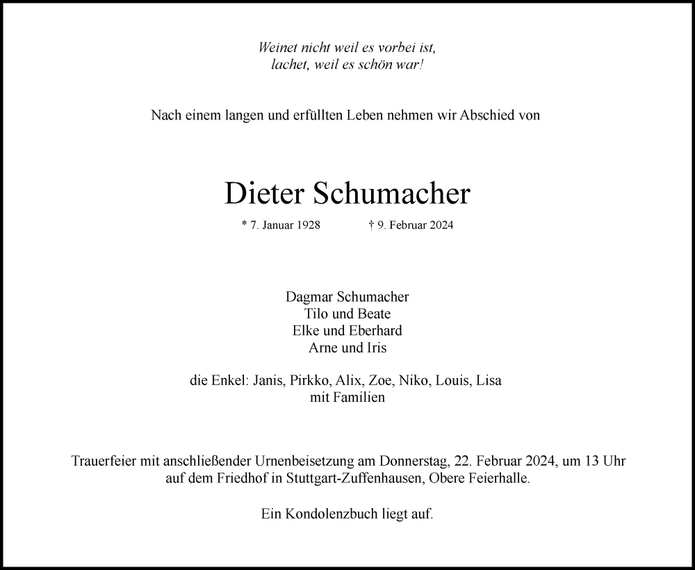 Hier finden Sie alle Traueranzeigen aus der Zeitung, die bisher für Dieter Schumacher erschienen sind. Weitere Traueranzeigen, die in der Zeitung erscheinen, werden hier ebenfalls aufgelistet