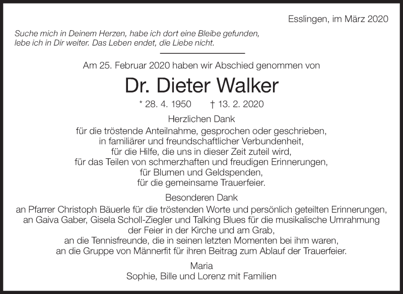 Hier finden Sie alle Traueranzeigen aus der Zeitung, die bisher für Dieter Walker erschienen sind. Weitere Traueranzeigen, die in der Zeitung erscheinen, werden hier ebenfalls aufgelistet