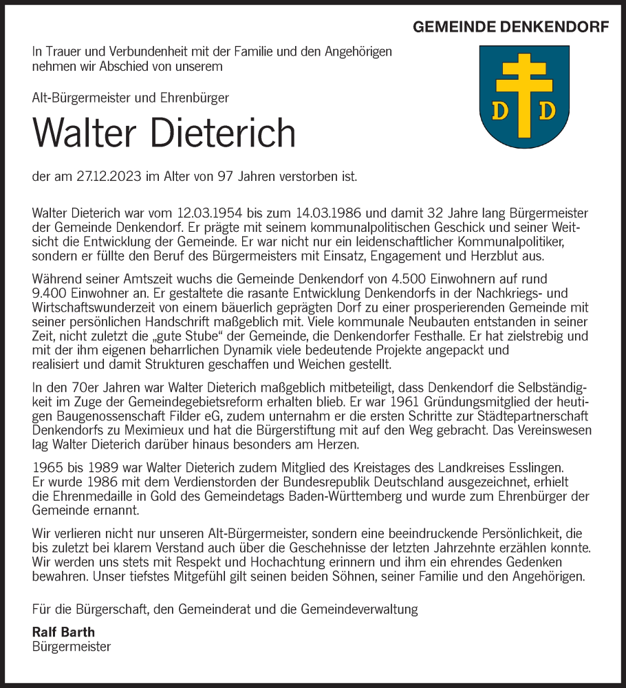 Hier finden Sie alle Traueranzeigen aus der Zeitung, die bisher für Dieterich Walter erschienen sind. Weitere Traueranzeigen, die in der Zeitung erscheinen, werden hier ebenfalls aufgelistet
