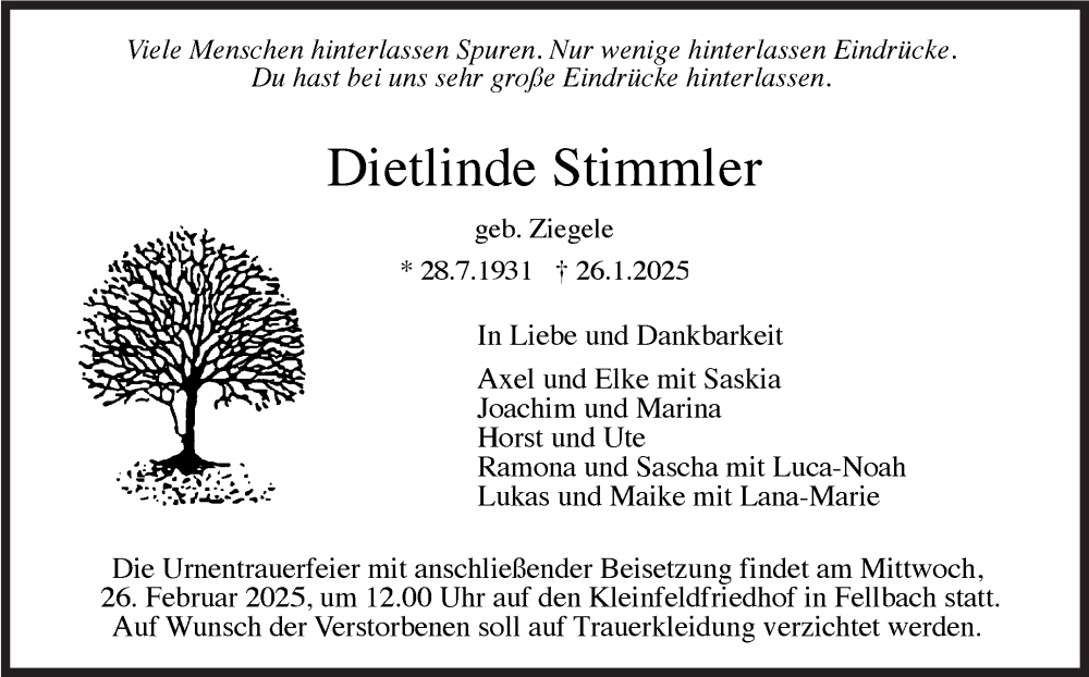 Hier finden Sie alle Traueranzeigen aus der Zeitung, die bisher für Dietlinde Stimmler erschienen sind. Weitere Traueranzeigen, die in der Zeitung erscheinen, werden hier ebenfalls aufgelistet