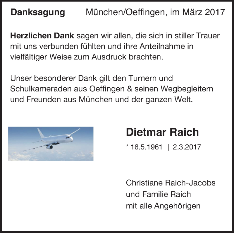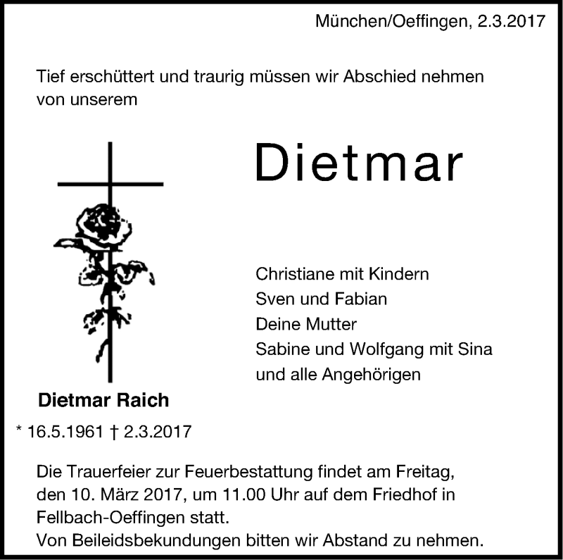 Hier finden Sie alle Traueranzeigen aus der Zeitung, die bisher für Dietmar Raich erschienen sind. Weitere Traueranzeigen, die in der Zeitung erscheinen, werden hier ebenfalls aufgelistet