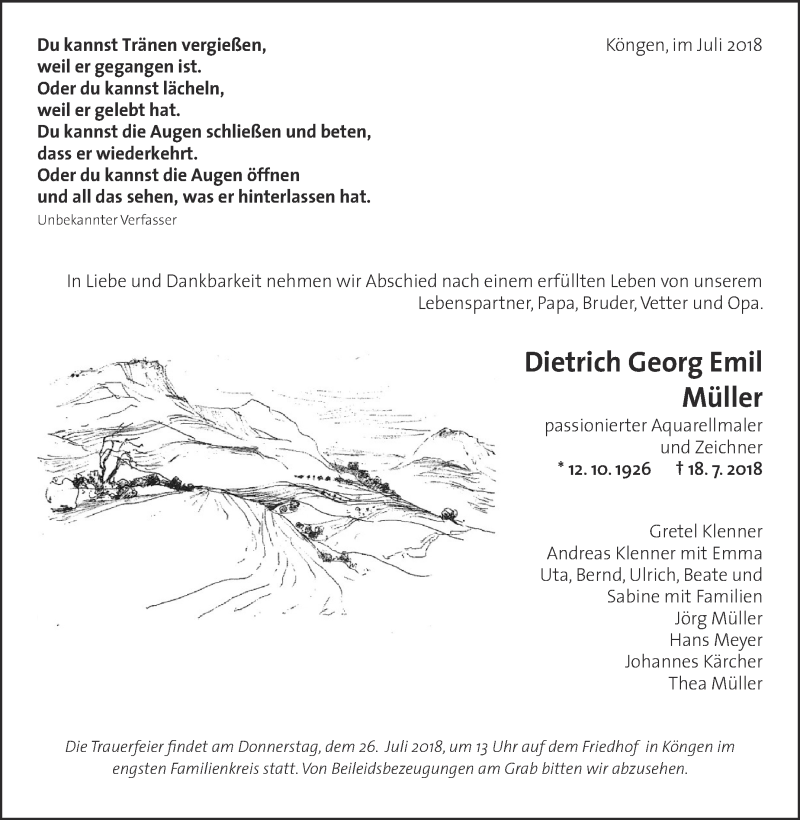Hier finden Sie alle Traueranzeigen aus der Zeitung, die bisher für Dietrich Georg Emil Müller erschienen sind. Weitere Traueranzeigen, die in der Zeitung erscheinen, werden hier ebenfalls aufgelistet
