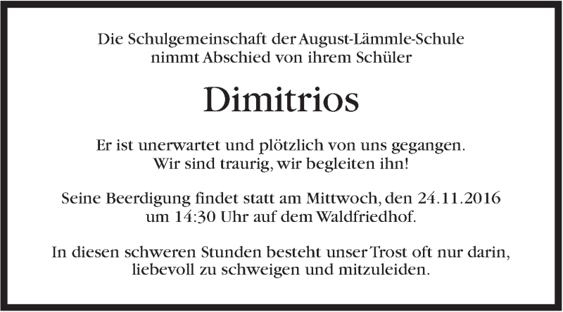 Hier finden Sie alle Traueranzeigen aus der Zeitung, die bisher für Dimitrios erschienen sind. Weitere Traueranzeigen, die in der Zeitung erscheinen, werden hier ebenfalls aufgelistet