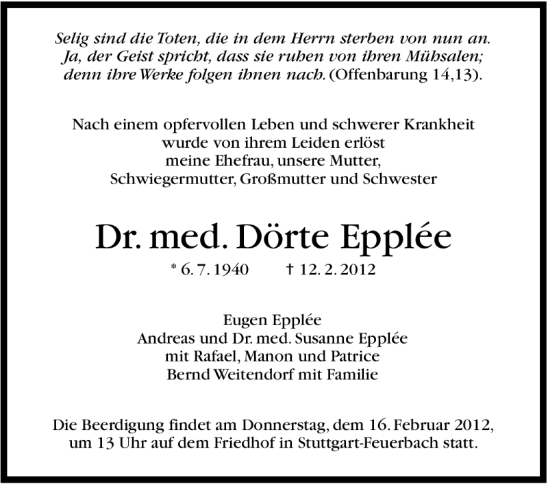 Hier finden Sie alle Traueranzeigen aus der Zeitung, die bisher für Dörte Epplee erschienen sind. Weitere Traueranzeigen, die in der Zeitung erscheinen, werden hier ebenfalls aufgelistet