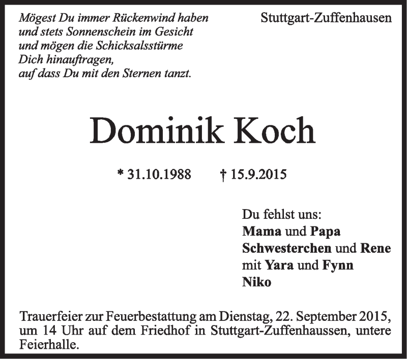 Hier finden Sie alle Traueranzeigen aus der Zeitung, die bisher für Dominik Koch erschienen sind. Weitere Traueranzeigen, die in der Zeitung erscheinen, werden hier ebenfalls aufgelistet