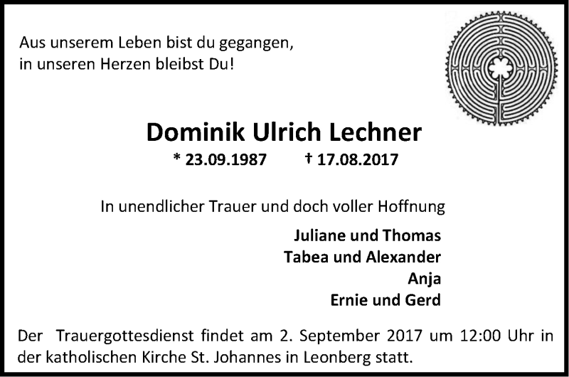 Hier finden Sie alle Traueranzeigen aus der Zeitung, die bisher für Dominik Ulrich Lechner erschienen sind. Weitere Traueranzeigen, die in der Zeitung erscheinen, werden hier ebenfalls aufgelistet