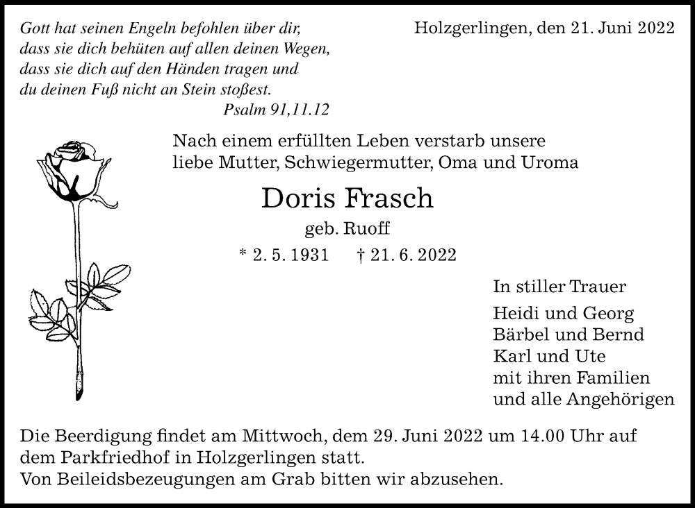 Hier finden Sie alle Traueranzeigen aus der Zeitung, die bisher für Doris Frasch erschienen sind. Weitere Traueranzeigen, die in der Zeitung erscheinen, werden hier ebenfalls aufgelistet