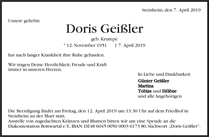 Hier finden Sie alle Traueranzeigen aus der Zeitung, die bisher für Doris Geißler erschienen sind. Weitere Traueranzeigen, die in der Zeitung erscheinen, werden hier ebenfalls aufgelistet