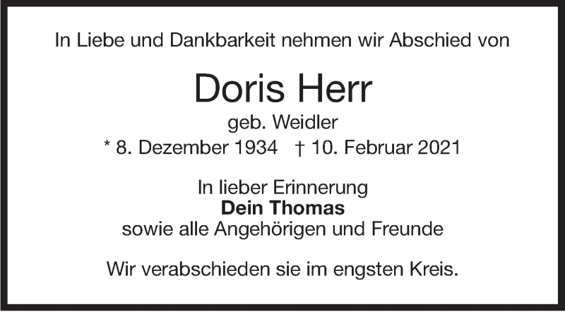 Hier finden Sie alle Traueranzeigen aus der Zeitung, die bisher für Doris Herr erschienen sind. Weitere Traueranzeigen, die in der Zeitung erscheinen, werden hier ebenfalls aufgelistet
