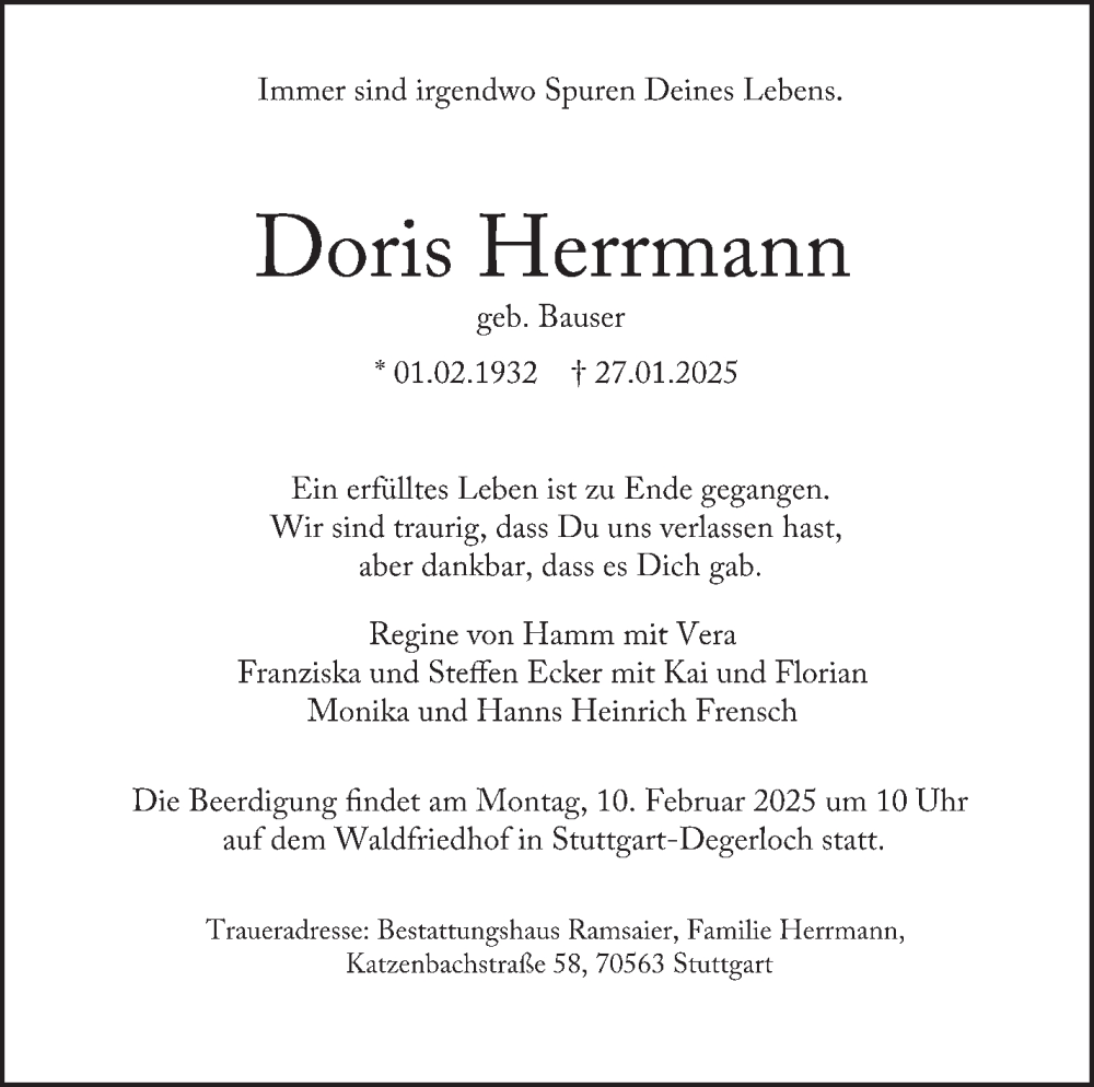 Hier finden Sie alle Traueranzeigen aus der Zeitung, die bisher für Doris Herrmann erschienen sind. Weitere Traueranzeigen, die in der Zeitung erscheinen, werden hier ebenfalls aufgelistet